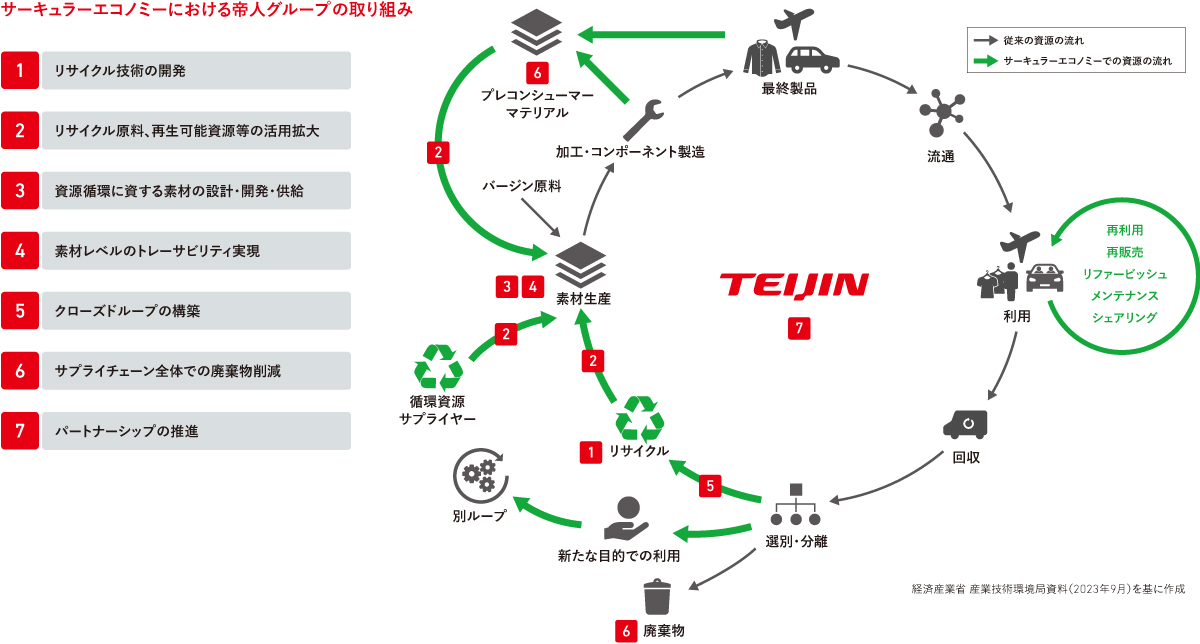 帝人グループは「サーキュラーエコノミーの実現」に向けた施策を推進しています。サーキュラーエコノミーの実現には、資源をできるだけ長く有効に使い続けることが重要です。資源の価値を保ちながら、効率的に活用することで、環境への負荷を減らし、廃棄物や有害物質の排出を製品やサービスのライフサイクル全体で最小限に抑えることが求められます。帝人グループは、さまざまなパートナーとの連携を通じて、バリューチェーンの各段階において①~⑦に示すような取り組みを推進しています。