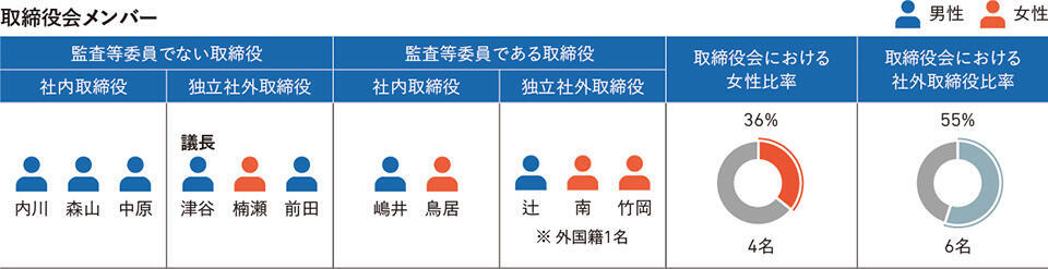 また、ジェンダーを含めた多様性の向上にも努めており、取締役のうち女性(楠瀬玲子、鳥居知子、南多美枝、竹岡八重子の4氏)の比率は36%です。なお、南多美枝氏は外国籍です。