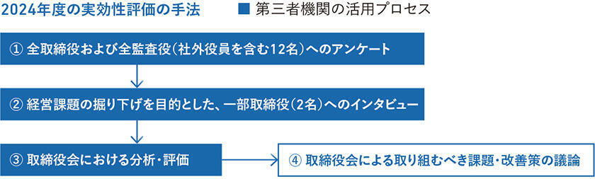 取締役会のさらなる実効性確保と機能向上を目的に、取締役会全体としての実効性に関する分析・評価を年に1回実施することとしています。