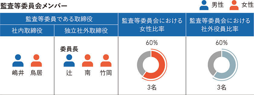 当社は、2025年6月に「監査等委員会設置会社」へと移行しました。当社の監査等委員会は5名(うち3名は女性)の監査等委員である取締役で構成し、当社の定める独立取締役の要件を満たす社外取締役は過半数の3名です。監査等委員会は法律や財務・会計などの専門性を有する監査等委員を擁し、専門的知見に基づき取締役の職務の執行を監査しています。