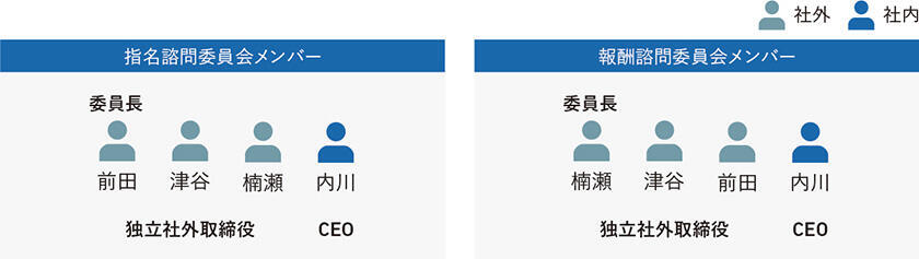 両委員会は、監査等委員でない社外取締役全員、会長およびCEO(会長空席の場合は、監査等委員でない社外取締役全員およびCEO)で構成します。各委員会の委員長は、監査等委員でない社外取締役から選定するものとし、委員長が各委員会の議長となります。なお、CEOに関する案件については、利害関係者であるCEOは原則として決定メンバーに入りません。また、会長に関する案件については、利害関係者である会長は原則として決定メンバーに入りません。