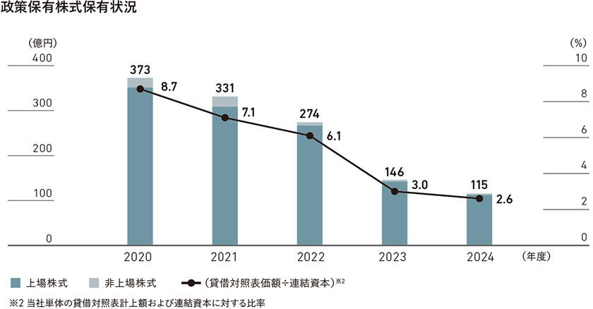 なお、検証の結果、保有意義が希薄化したと判断したものについては売却を進めており、2024年度においても、特定投資株式2銘柄、みなし保有株式2銘柄の全保有株数(うち、1銘柄は重複)、特定投資株式2銘柄の一部保有株数を売却し、売却価額の合計は55億円(うち、みなし保有株式については36億円)となりました。